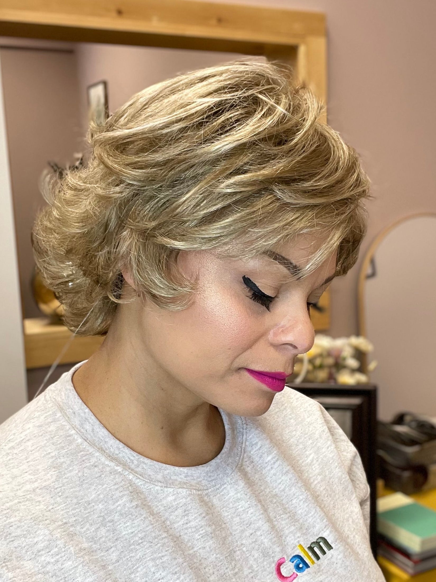 Use your fingers to gently lift the layers at the crown and let those flipped ends do their thing for extra sass.