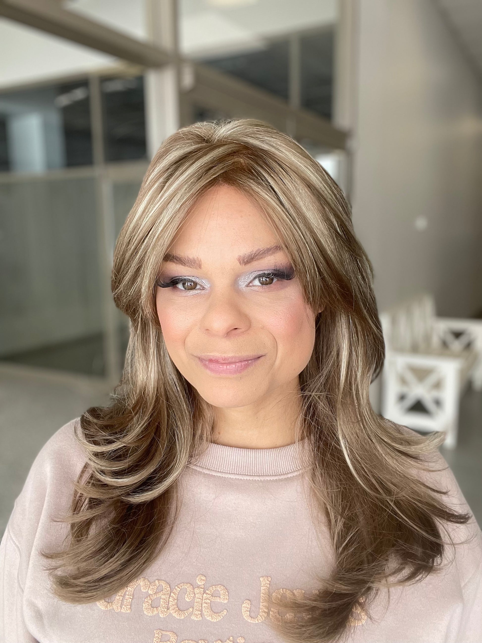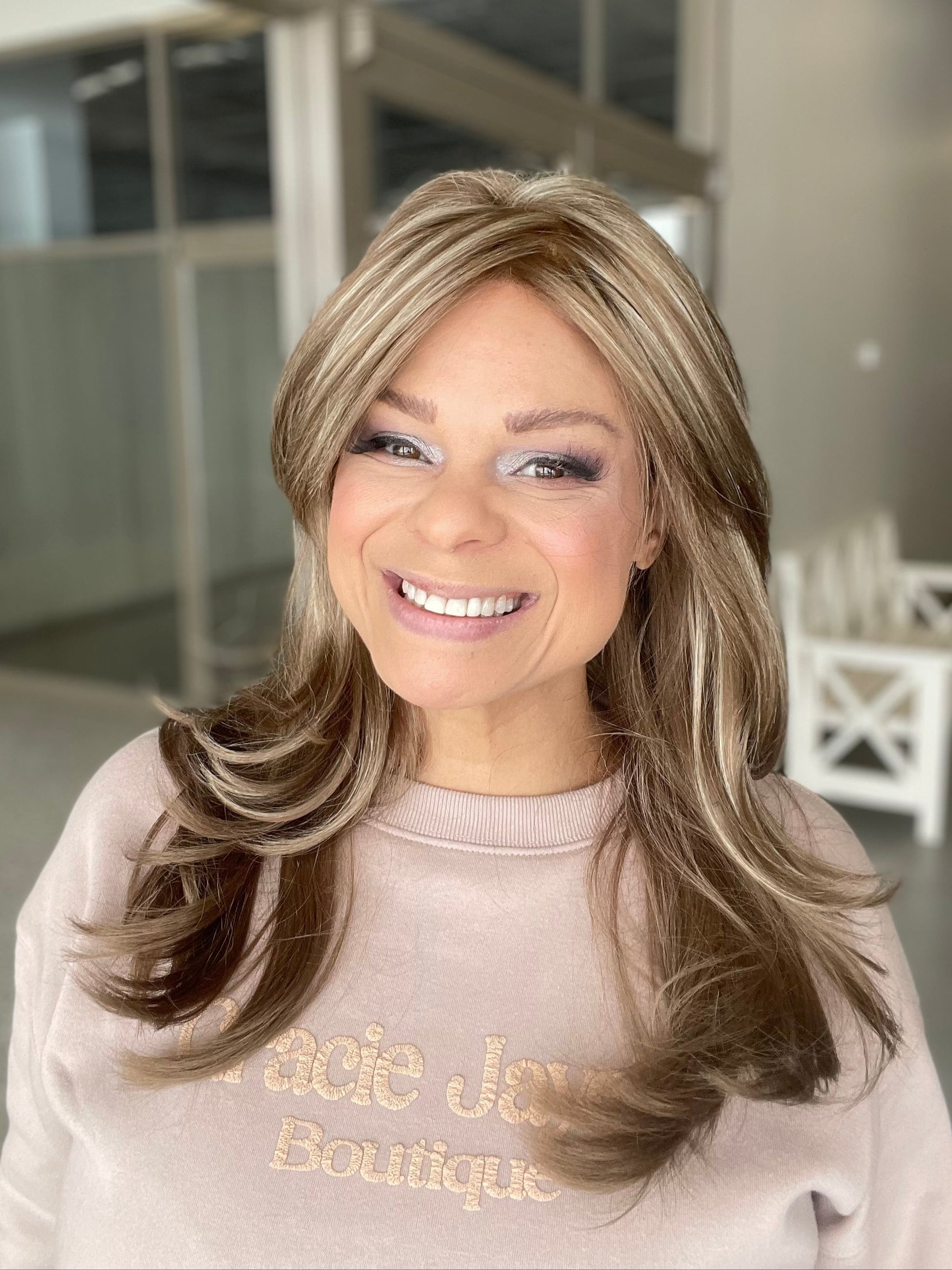 Brooke by Envy offers our Mono Top Lace Front construction on this long, sultry and sexy styling. Long flirty bangs can be swept to the side or worn off the face while soft angles frame the face. Lightweight and luxurious, this mono top construction creates the illusion of a natural hairline and part.