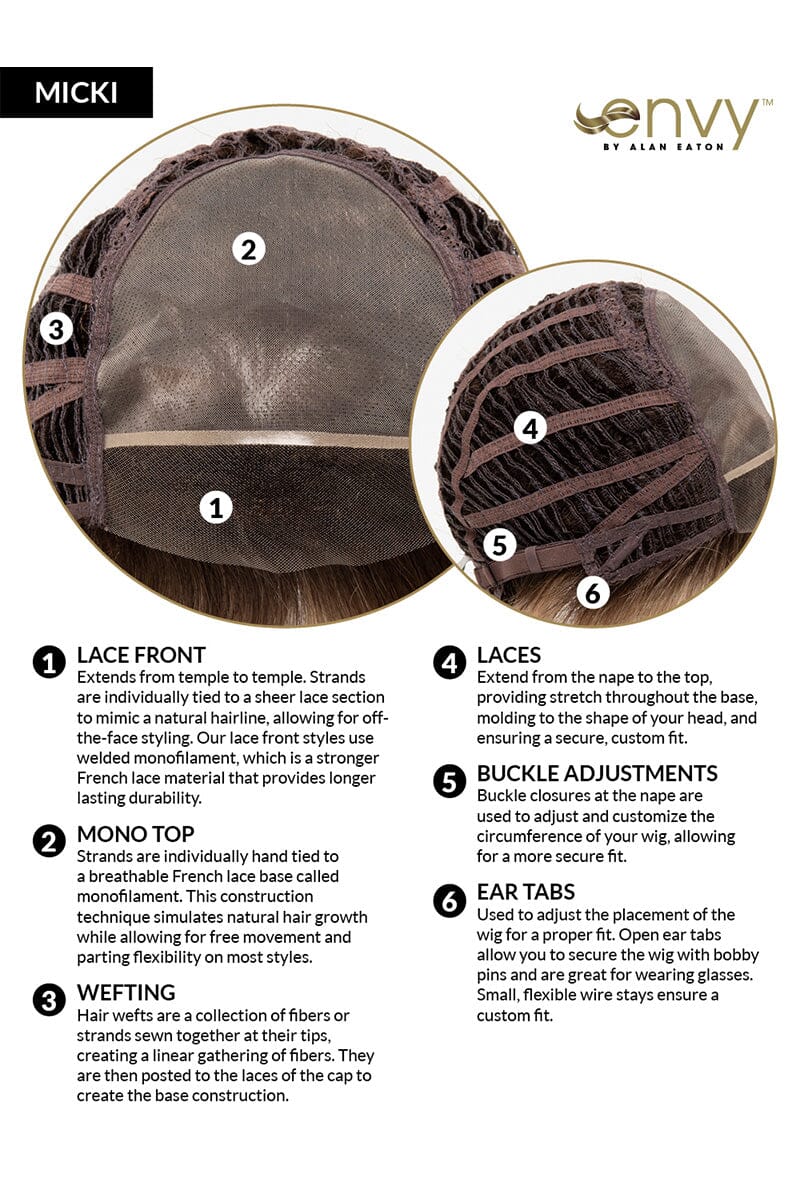 Description Lace Front Mono Top technology combines with soft layering to make Micki by Envy the ultimate natural, lightweight fashion statement. Comb her spunky razored edges back or off to the side to create your own unique style—the lace front hairline will hide your every move. Color Shown: Light Brown, Dark Blonde, Champagne Shadow, Saffron Spice, Macchiato, Platinum Shadow Cap Design: Monofilament Top Cap, Lace Front Cap Highlight Features: Ready-to-Wear Synthetic Hair Fibers: Perfect for every occasion Envy's Ready-to-Wear Synthetic Hair Fibers are designed with 100% Kanekalon hair. These ready-to-wear synthetic wigs were crafted for longevity, holding style and color.