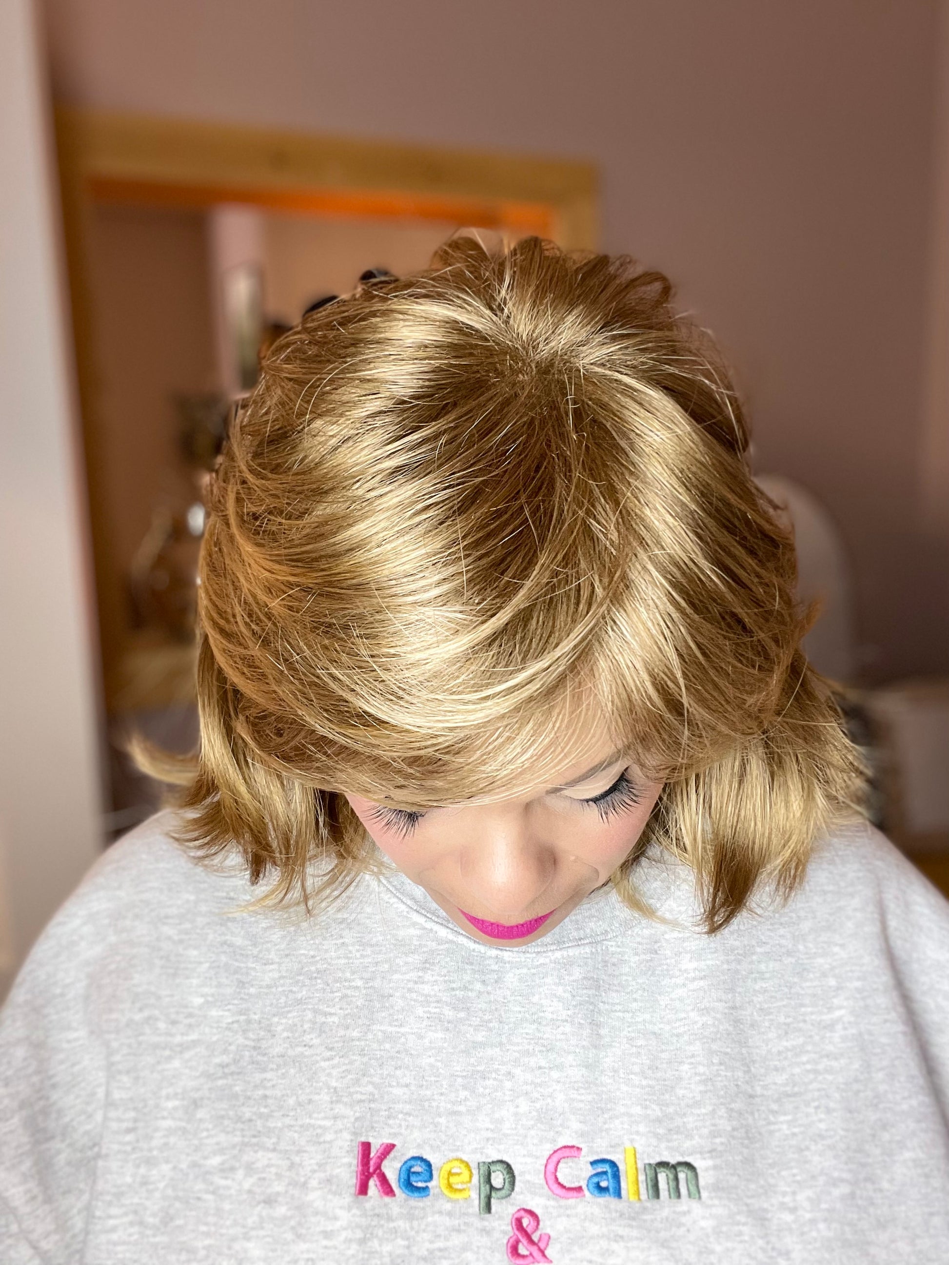 Use your fingers or a wide-tooth comb to fluff the layers at the crown for a fuller, more natural look.